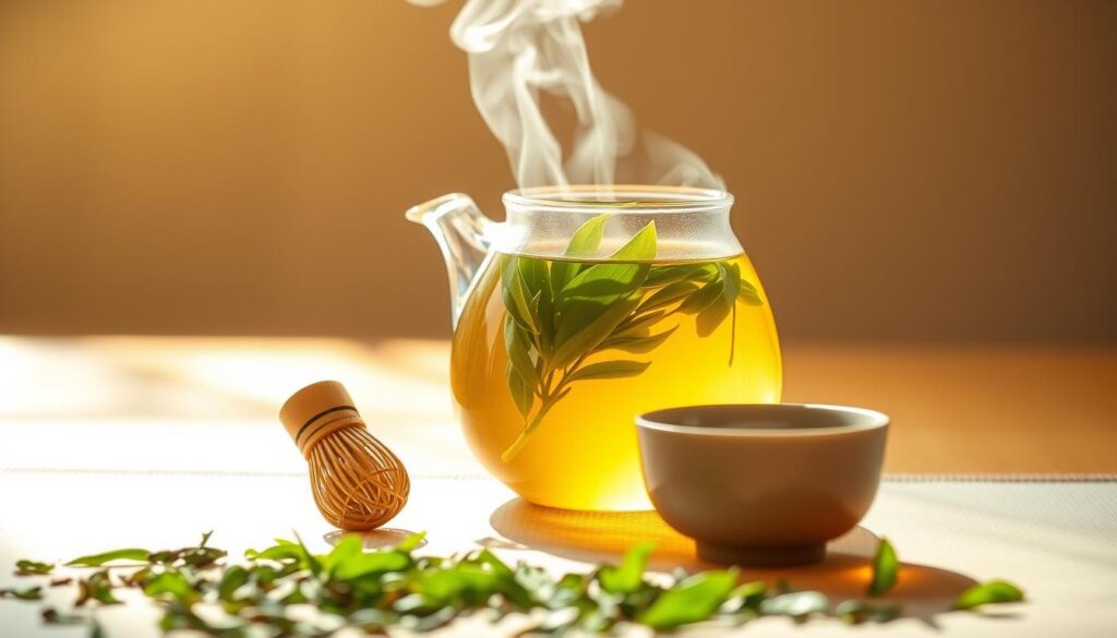 A delicate Japanese green tea, its vibrant green leaves gently unfurling in a glass teapot, steam rising from the translucent amber brew. The scene is bathed in warm, natural light, creating a soothing, calming atmosphere. In the foreground, the teapot is flanked by a small bamboo whisk and a ceramic tea cup, suggesting the ritual and mindfulness of the tea ceremony. The middle ground features a scattering of fresh tea leaves, while the background shows a simple, minimalist environment, allowing the tea to be the focus of the image. The overall mood is one of tranquility, vitality, and mindfulness - qualities that could contribute to enhanced physical performance.