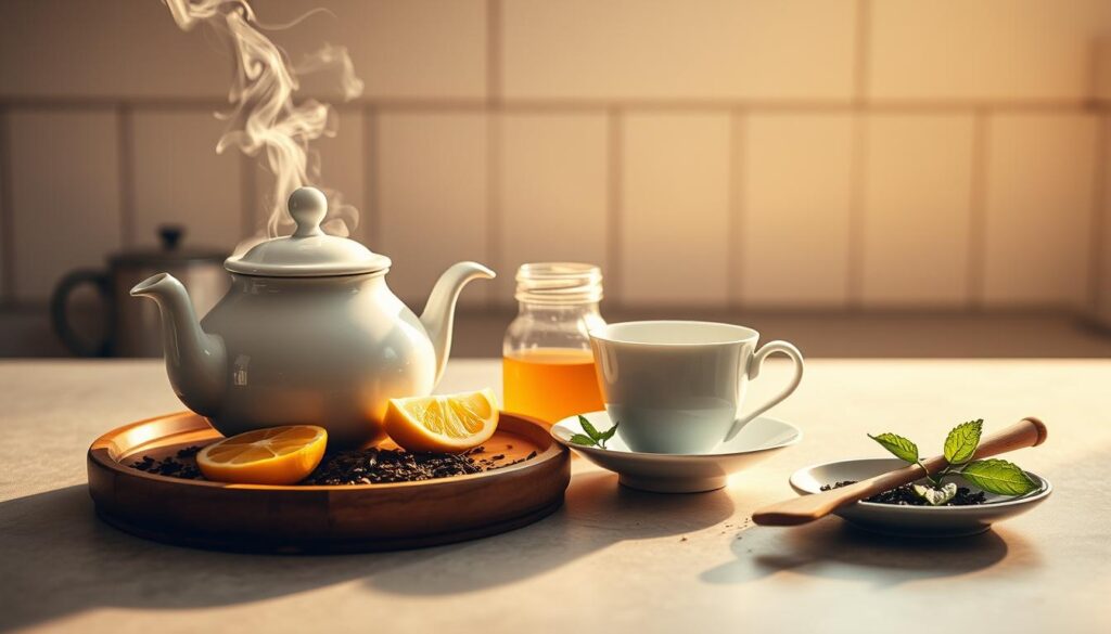 A cozy kitchen counter with a vintage tea set arrangement. In the foreground, a steaming porcelain teapot rests on a wooden tray, accompanied by a delicate teacup and saucer. Fragrant tea leaves and a few slices of lemon create a visually appealing display. The middle ground features a small glass jar filled with honey, a wooden spoon, and a few sprigs of fresh mint. Soft, warm lighting casts a golden glow, creating a soothing and inviting atmosphere. The background showcases a simple, clean-lined kitchen wall, allowing the tea preparation to be the central focus. This image captures the ritual and care involved in properly brewing a revitalizing cup of Té Vitalidad.