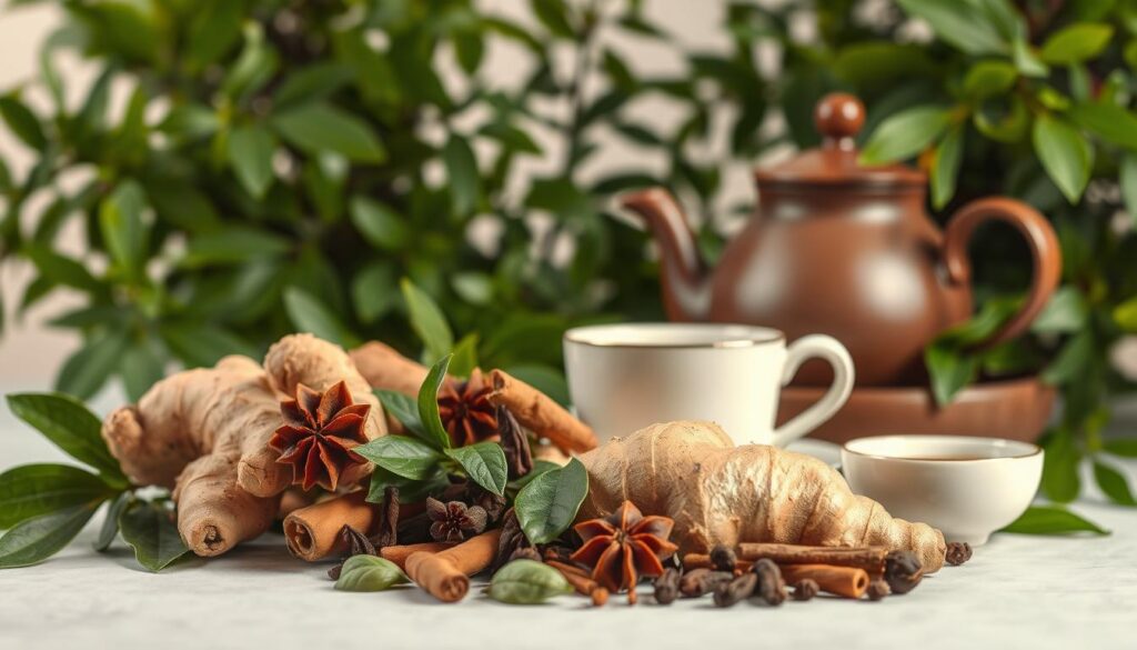 A vibrant still life arrangement showcasing the natural ingredients that compose the Vitalidad tea. In the foreground, a selection of fresh, organic herbs and spices are artfully displayed, including ginger root, cinnamon sticks, and whole cloves. The midground features a traditional ceramic teapot and delicate tea cups, hinting at the brewing process. In the background, lush, verdant foliage frames the scene, creating a soothing, earthy atmosphere. The lighting is soft and diffused, highlighting the warm, rich tones of the ingredients. The entire composition conveys a sense of wholesome nourishment and natural wellness, reflecting the inherent benefits of the Vitalidad tea.