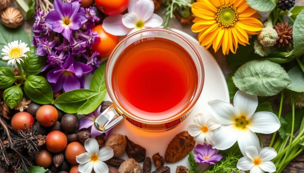 Imagen de una taza de Té Vitalidad con ingredientes naturales alrededor