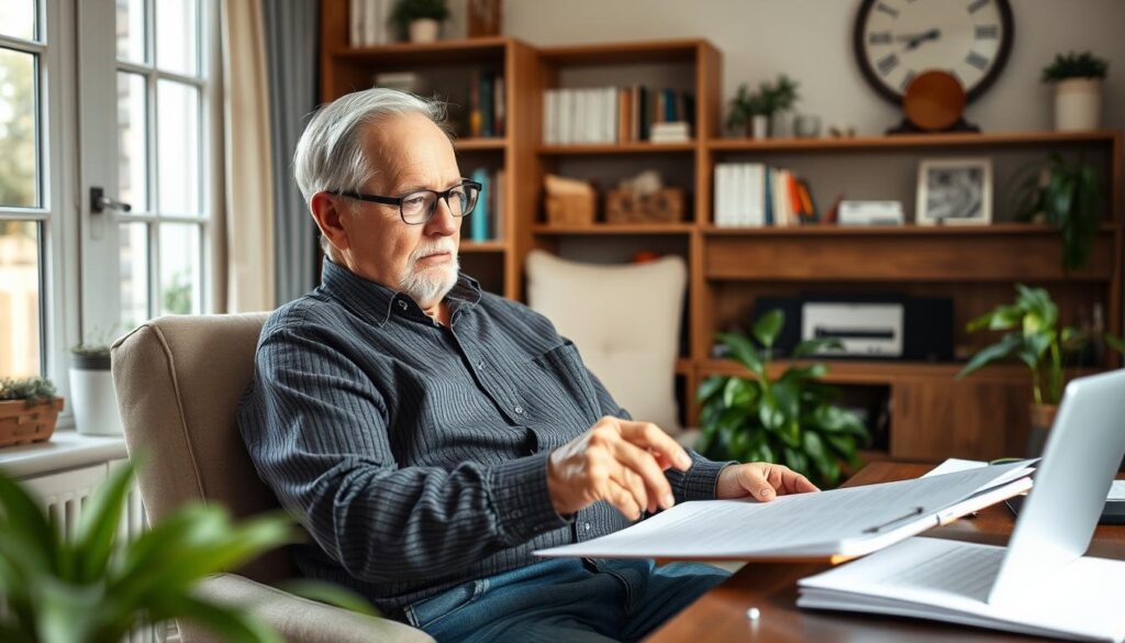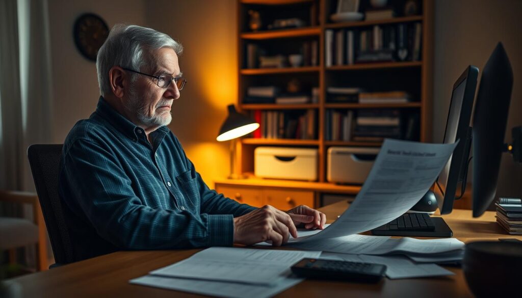 A dimly lit home office scene, with a retired senior citizen sitting at a desk, reviewing financial documents and contemplating the requirements for a loan application. The desk is adorned with a desktop computer, a calculator, and scattered papers. Warm, soft lighting illuminates the space, creating a contemplative atmosphere. The retiree's face is focused, expressing a mix of determination and mild concern as they navigate the loan process. In the background, shelves filled with books and personal mementos suggest a lifetime of experience and wisdom. The overall composition conveys a sense of thoughtful decision-making and financial responsibility during retirement.