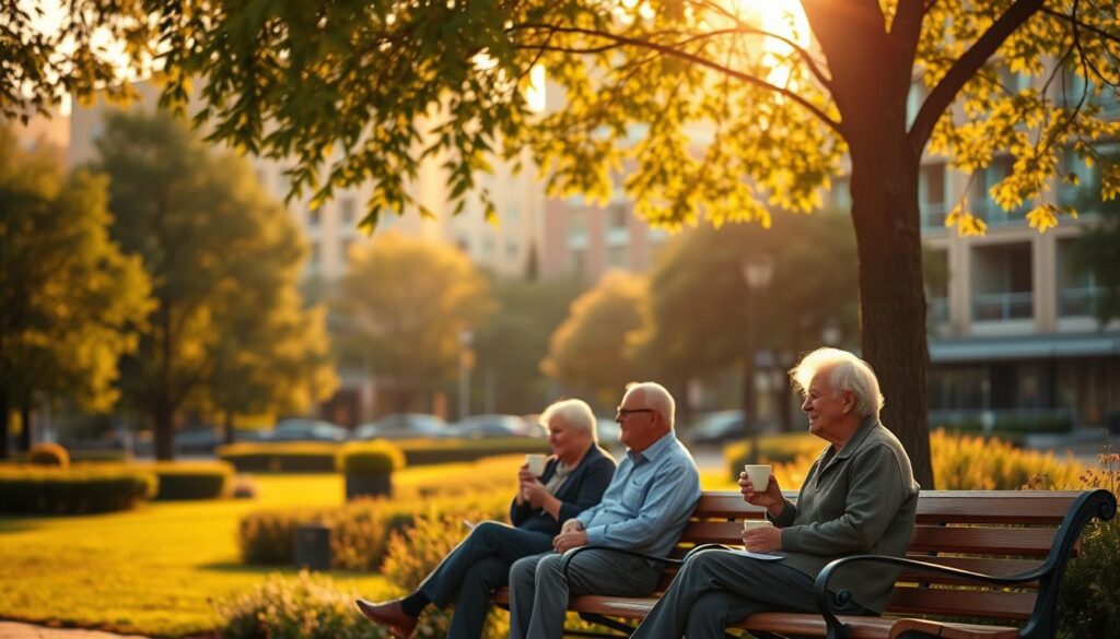 A serene and tranquil scene of elderly retirees enjoying the benefits of easy retirement loans. In the foreground, a group of retirees sit contentedly on park benches, discussing their financial plans and sipping coffee. The middle ground showcases a picturesque urban setting with well-maintained buildings and lush greenery. Warm, golden sunlight filters through the trees, casting a soft, inviting glow over the scene. In the background, a modern financial institution stands, representing the availability of accessible retirement loan solutions. The overall atmosphere conveys a sense of financial security, contentment, and the positive impact of retirement loan programs on the lives of senior citizens.
