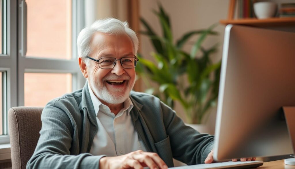Imagen de una persona jubilada sonriendo mientras usa una computadora